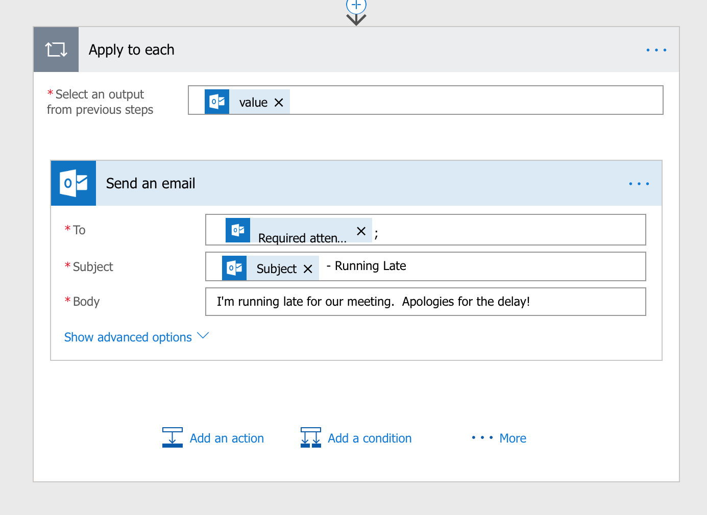Now that we have the information for the meeting we are running late to, all that's left is to add a "Send Email" action so we can notify the attendees. The "To" field will be the attendees property from our Get Events Action. The Subject will use the "Subject" field from our Get Events Action and we will add "Running Late". Then we will fill out the body with a sincere apology and will let them know you'll be there soon.