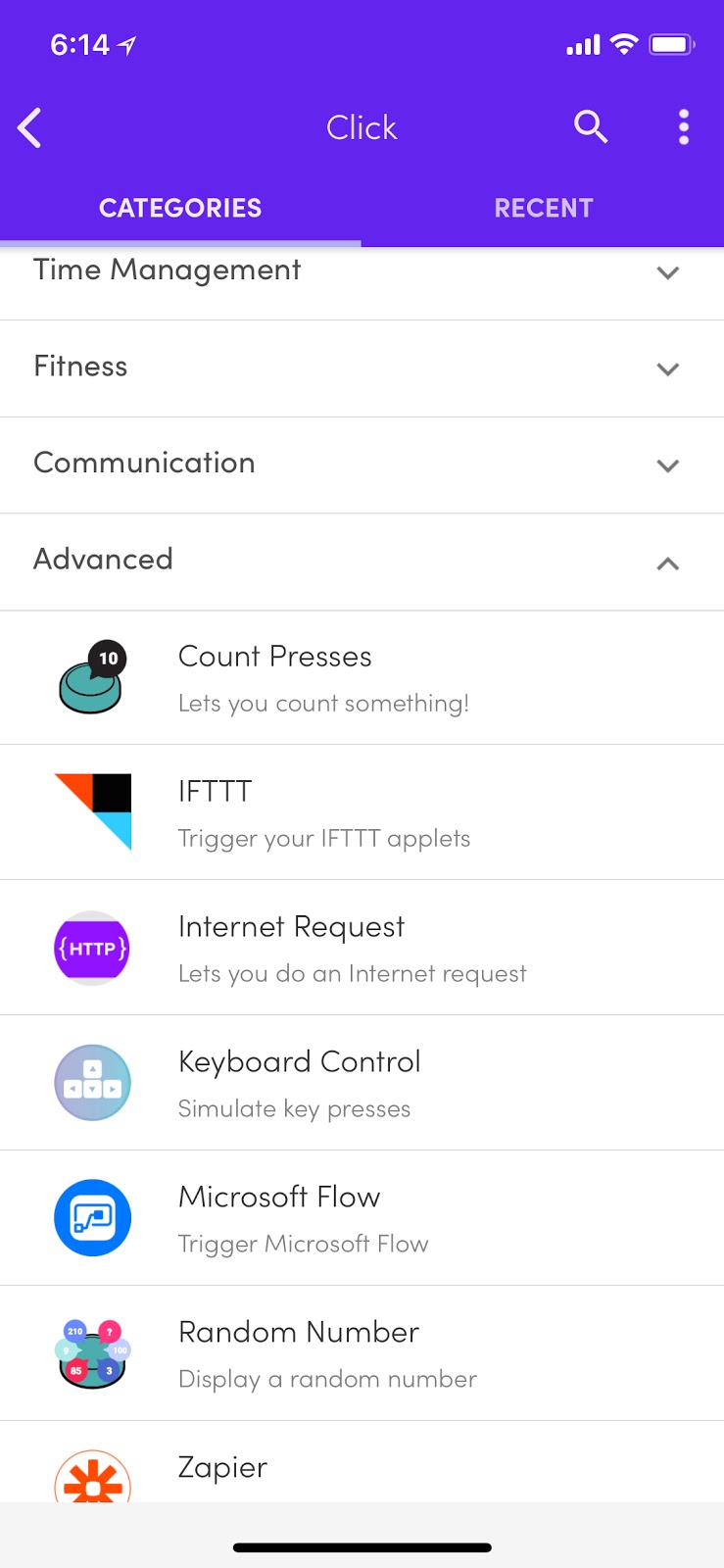 Before we start building the Flow we need to make sure our Flic button is set up. The important thing to know about the Flic button is it has to be tied to your cell phone. You have to download the Flic App on your IOS or Android device, create an account and run through the wizard to add your Flic button. Once you have that configured, you have to tell it that you want to use Microsoft Flow for the action (Click, Double Click, or Hold). Just click the Plus (+) button next to the action you want to trigger on and scroll down to the "Advanced" section on the next screen and select "Microsoft Flow".