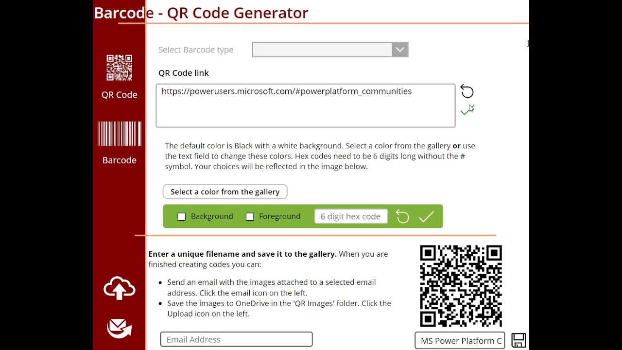 Using minimal code, a data connection to Office365Outlook and a single link to an external resource, the app utilizes the Online Barcode API at GitHub, rather than the deprecated Google Chart API, to generate the selected barcode/QR code using the parameters you specify.