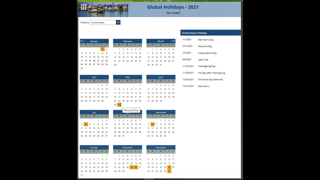 This visual calendar began as a project to replace a a list of Holidays. The list didn't offer a calendar style view with highlighting. There was no ability to compare holidays in different places.