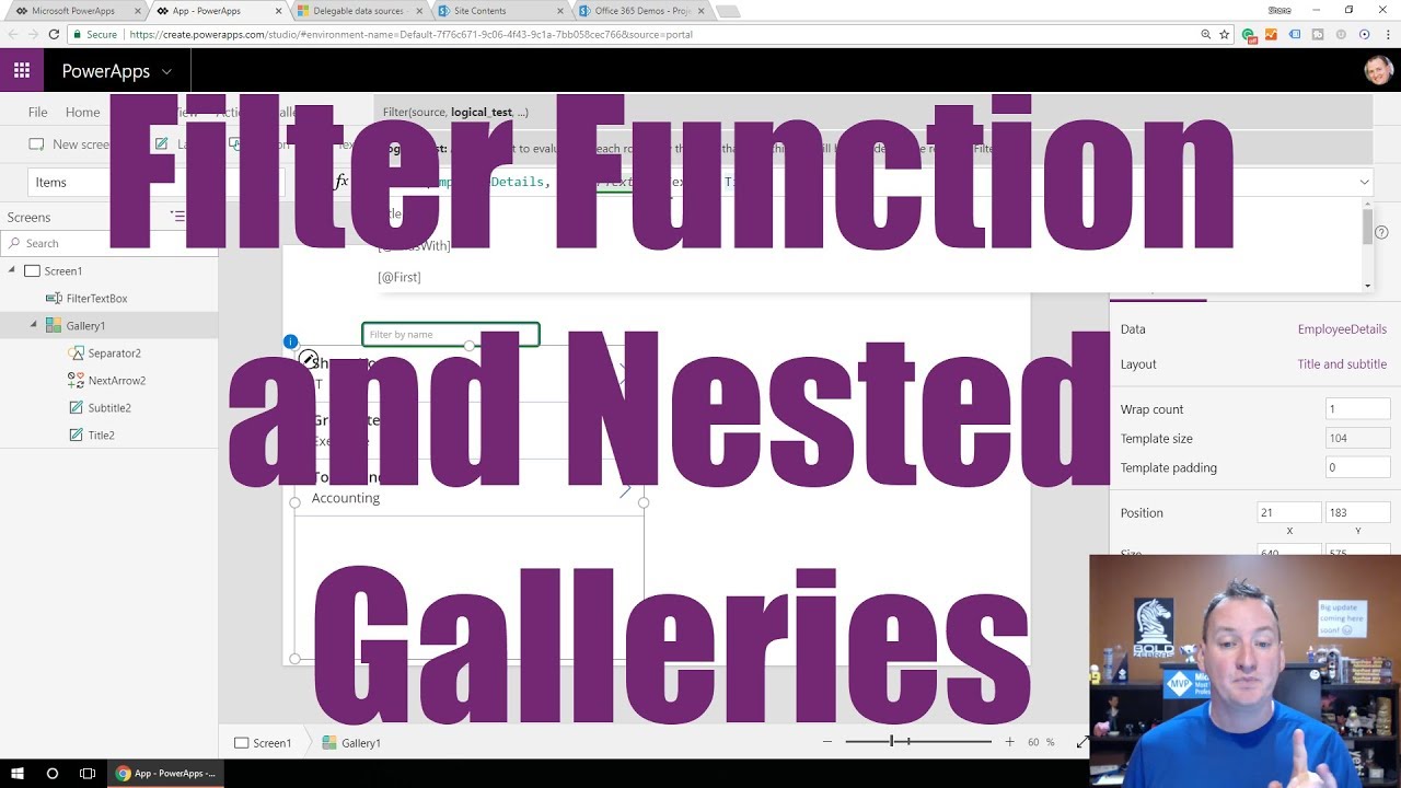 In this video, you get to explore the fun that is the Filter function. We go over the function, how it works with SharePoint and delegation, and finally, we use it to build nested galleries. Kind of fun, if you are a nerd like me.