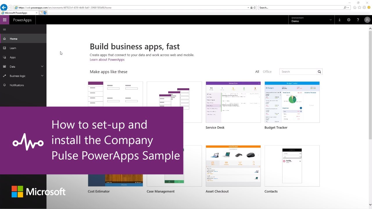 Learn how to set-up the Company Pulse PowerApps Sample and make it your own. The Company Pulse PowerApps Sample lets you browse a feed of custom company news based in SharePoint that is augmented with Twitter, Yammer, and trending relevant documents. Check out the Company Pulse