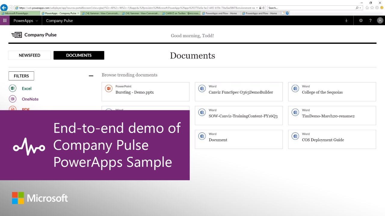 In this video, get an end-to-end functional demonstration of the Company Pulse PowerApps Sample. With Company Pulse, you can browse a feed of custom company news based in SharePoint that is augmented with Twitter, Yammer, and trending relevant documents. Learn more: https://aka.ms/CompanyPulse