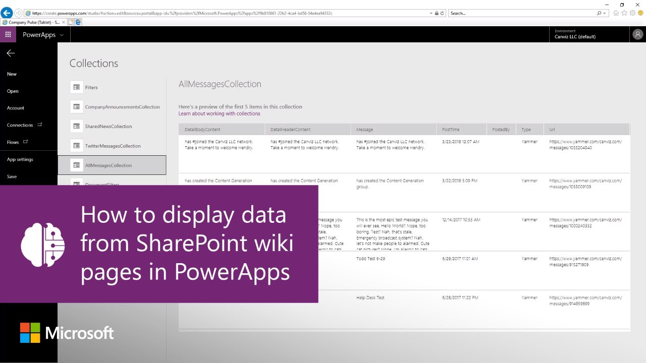 In this video, get a deep dive into the Company Pulse PowerApps Sample template. Learn how to display data from SharePoint wiki pages inside of a PowerApp. Check out the Company Pulse