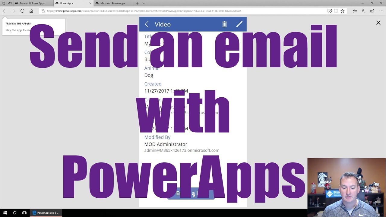 This is a quick video that walks you through connecting your Office 365 Outlook account so you can send emails directly from PowerApps. It also shows you how to accept inputs for that email and how to use a button. Fancy stuff.