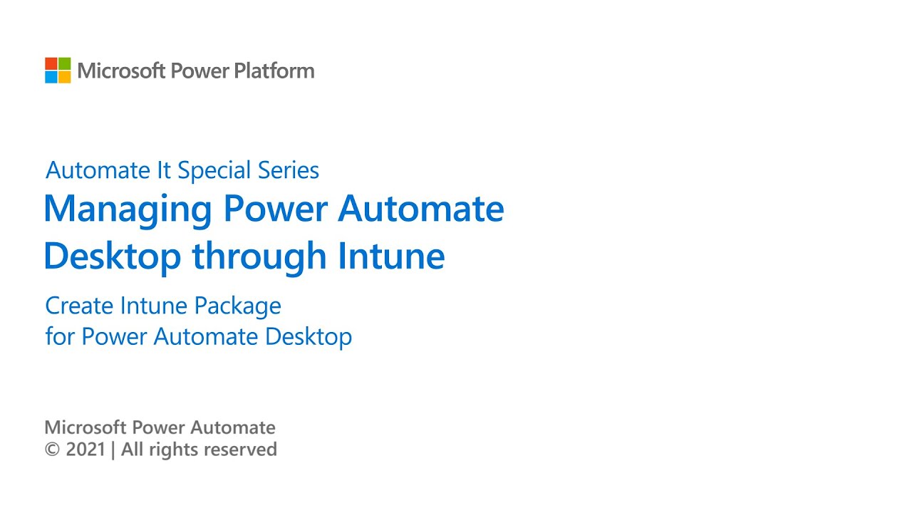 In this episode, we will show you how to deploy Power Automate Desktop through Intune. We will be creating groups in Azure Active directory and also creating an Intune package to deploy Power Automate Desktop app. Resources Power Automate Desktop on Windows Whitepaper: https://aka.ms/padonwindowspnp Microsoft Endpoint Manager documentation: https://docs.microsoft.com/en-us/mem/ Microsoft Intune documentation: https://docs.microsoft.com/en-us/mem/... Manage and protect mobile and desktop applications with Microsoft Endpoint Manager: https://techcommunity.microsoft.com/t... Governance in Power Automate Desktop: https://docs.microsoft.com/en-us/powe...