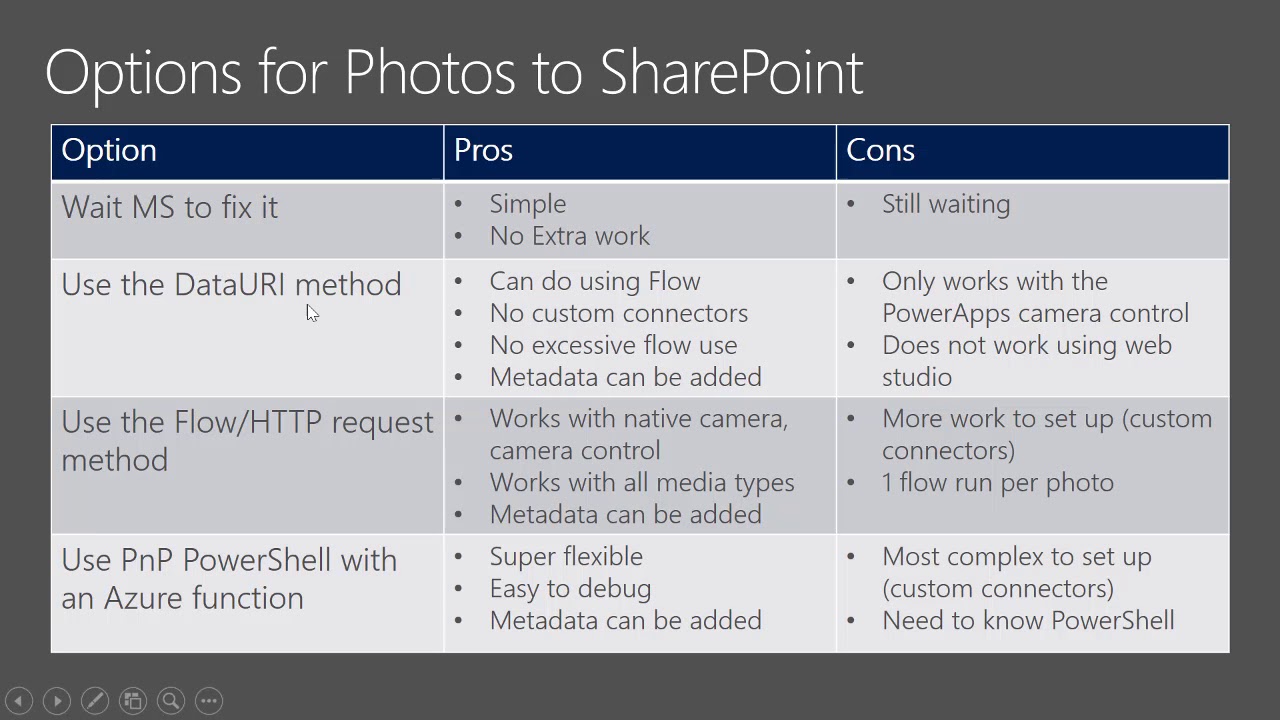 This video illustrates the utility of Microsoft Flow in being able to address a (current) limitation of PowerApps - namely support for handling photo uploads. This method involves no custom code, and can handle setting SharePoint metadata as well as handling other media like audio recordings from PowerApps too. For a sample Swagger file that you can use, visit this article...