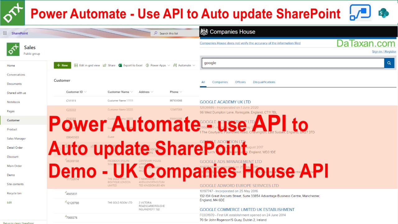 The use case in this video is using Microsoft Power Automate get Company Name and Company Address with UK Companies House API and then auto parse to SharePoint (or Excel Online / Google Sheets...)